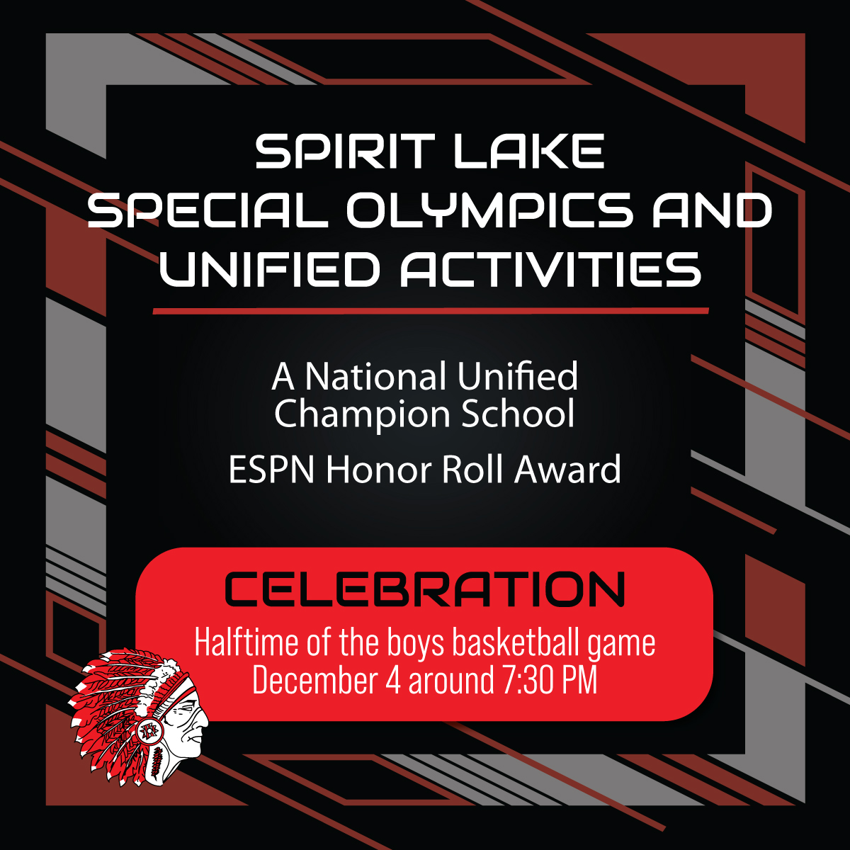 Spirit Lake MS and HS have both been named National Unified Champion Schools. The HS also earned the ESPN Honor Roll Award. We will be celebrating these achievements at halftime of the boys basketball game on Thursday, December 4, around 7:30 PM.
