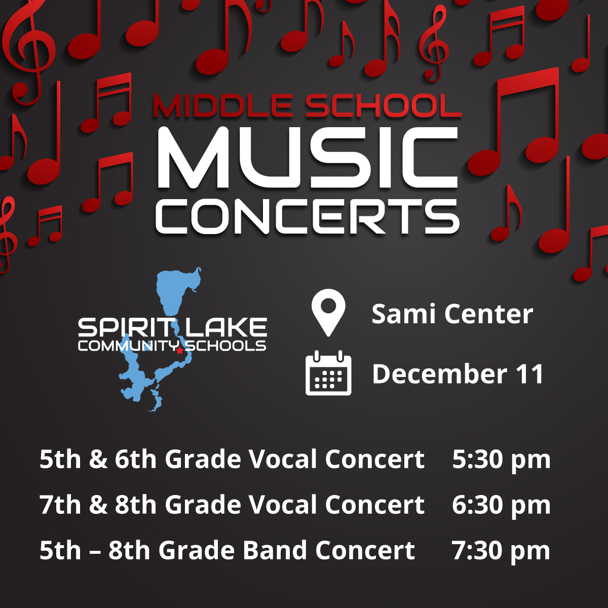 🎶 Spirit Lake Middle School Winter Concert is almost here! Join us on Thur., Dec. 11 for an evening of music from our 5th–8th grade vocal & band studentst.